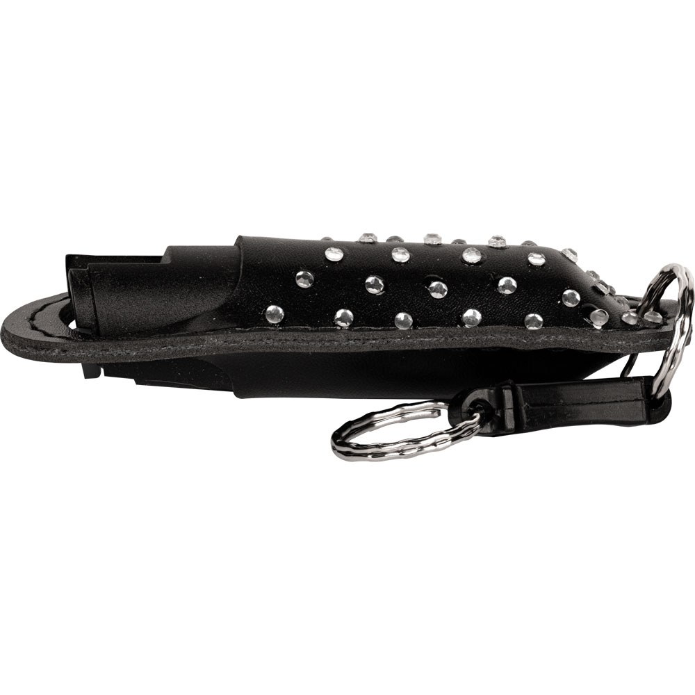 Pepper Shot 1.2% MC 1/2 oz Halo Rhinestone leatherette holster black. Pepper Shot Pepper Spray is made with 1.2% Major Capsaicinoids. The Major Capsaicinoids are the true heat measure and Pepper Shot 1.2% MC is more effective than of most other pepper sprays. In addition to causing an attacker pain, The Pepper Shot 8.5% oleoresin capsicum formula swells the mucous membranes, which makes breathing difficult, and swells the veins in the eyes, causing the eyes to close. It's made from 2,000,000 SHU's of raw pepper and these effects can last up to 45 minutes and cause no permanent damage. Has a UV identifying dye to help aid in the identification of an attacker. 1/2 oz with halo rhinestone leatherette holster, locking actuator and quick key release keychain. Effective up to 6-8 feet. Contains 6-10 one second bursts. 4 ¼" x 1 ½"
