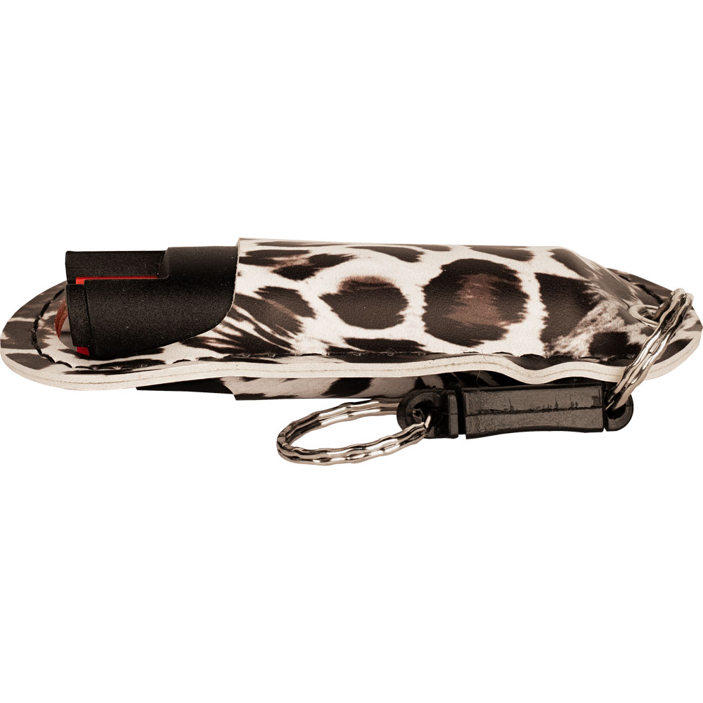 Pepper Shot 1.2% MC 1/2 oz Halo Holster and quick release keychain Leopard Black/White. Pepper Shot Pepper Spray is made with 1.2% Major Capsaicinoids. The Major Capsaicinoids are the true heat measure and Pepper Shot 1.2% MC is more effective than of most other pepper sprays. In addition to causing an attacker pain, The Pepper Shot 8.5% oleoresin capsicum formula swells the mucous membranes, which makes breathing difficult, and swells the veins in the eyes, causing the eyes to close. It's made from 2,000,000 SHU's of raw pepper and these effects can last up to 45 minutes and cause no permanent damage. Has a UV identifying dye to help aid in the identification of an attacker. This model has a 1/2 ounce spray with halo holster, locking actuator and quick key release keychain. Effective up to 6-8 feet. Contains 6-10 one second bursts. 4 ¼" x 1 ⅝"