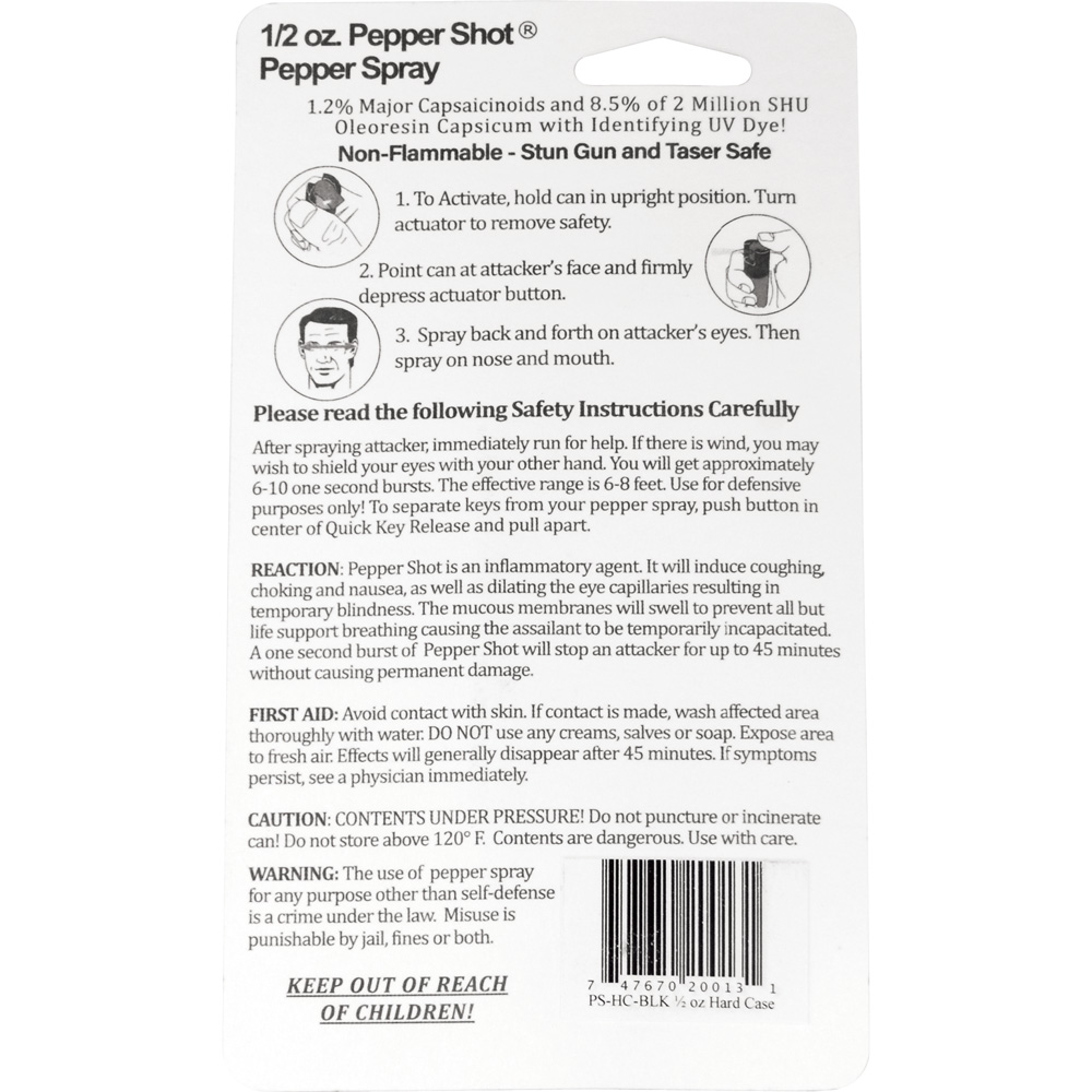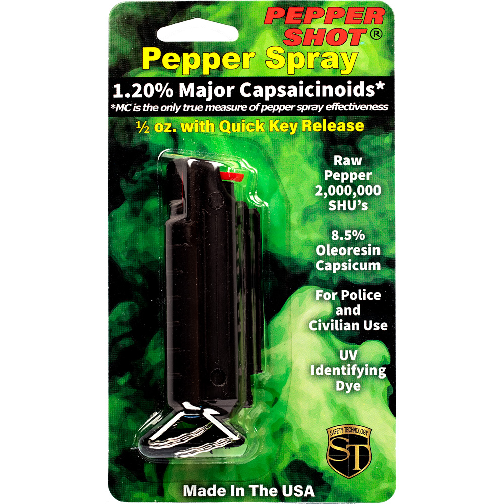 Pepper Shot 1.2% MC 1/2 oz pepper spray hard case belt clip and quick release keychain black. Pepper Shot Pepper Spray is made with 1.2% Major Capsaicinoids. The Major Capsaicinoids are the true heat measure and Pepper Shot 1.2% MC is more effective than of most other pepper sprays. In addition to causing an attacker pain, The Pepper Shot 8.5% oleoresin capsicum formula swells the mucous membranes, which makes breathing difficult, and swells the veins in the eyes, causing the eyes to close. It's made from 2,000,000 SHU's of raw pepper and these effects can last up to 45 minutes and cause no permanent damage. Has a UV identifying dye to help aid in the identification of an attacker. Pepper Shot 1/2 oz. Pepper Spray has a range of 6-8 feet and comes with a hard case. Each unit provides 6-10 one-second bursts and comes with a quick key release keychain, and safety lock. 3 ½" x 1 ½"
