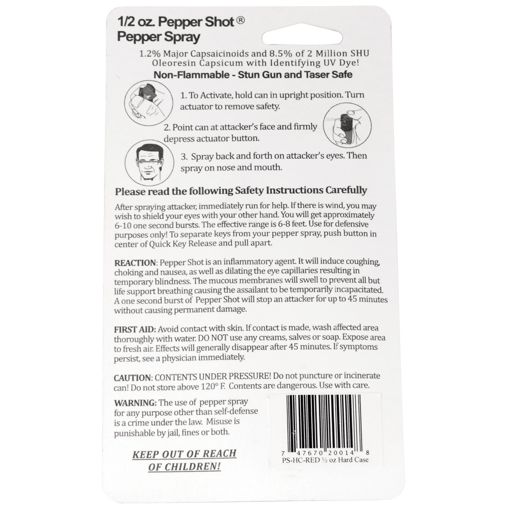 Pepper Shot 1.2% MC 1/2 oz pepper spray hard case belt clip and quick release keychain red. Pepper Shot Pepper Spray is made with 1.2% Major Capsaicinoids. The Major Capsaicinoids are the true heat measure and Pepper Shot 1.2% MC is more effective than of most other pepper sprays. In addition to causing an attacker pain, The Pepper Shot 8.5% oleoresin capsicum formula swells the mucous membranes, which makes breathing difficult, and swells the veins in the eyes, causing the eyes to close. It's made from 2,000,000 SHU's of raw pepper and these effects can last up to 45 minutes and cause no permanent damage. Has a UV identifying dye to help aid in the identification of an attacker. Pepper Shot 1/2 oz. Pepper Spray has a range of 6-8 feet and comes with a hard case. Each unit provides 6-10 one-second bursts and comes with a quick key release keychain, and safety lock. 3 ½" x 1 ½"