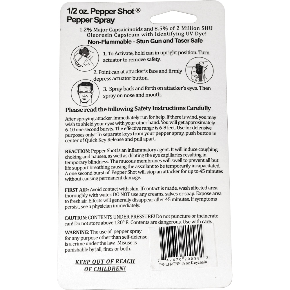 Pepper Shot 1.2% MC 1/2 oz pepper spray fashion leatherette holster and quick release keychain cheetah black/pink. Pepper Shot Pepper Spray is made with 1.2% Major Capsaicinoids. The Major Capsaicinoids are the true heat measure and Pepper Shot 1.2% MC is more effective than of most other pepper sprays. In addition to causing an attacker pain, The Pepper Shot 8.5% oleoresin capsicum formula swells the mucous membranes, which makes breathing difficult, and swells the veins in the eyes, causing the eyes to close. It's made from 2,000,000 SHU's of raw pepper and these effects can last up to 45 minutes and cause no permanent damage. Has a UV identifying dye to help aid in the identification of an attacker. Pepper Shot 1/2 oz. Pepper Spray has a range of 6-8 feet and comes with a leatherette holster. Each unit provides 6-10 one-second bursts and comes with a quick key release keychain, and safety lock. 4 ¼" x 1 ½"