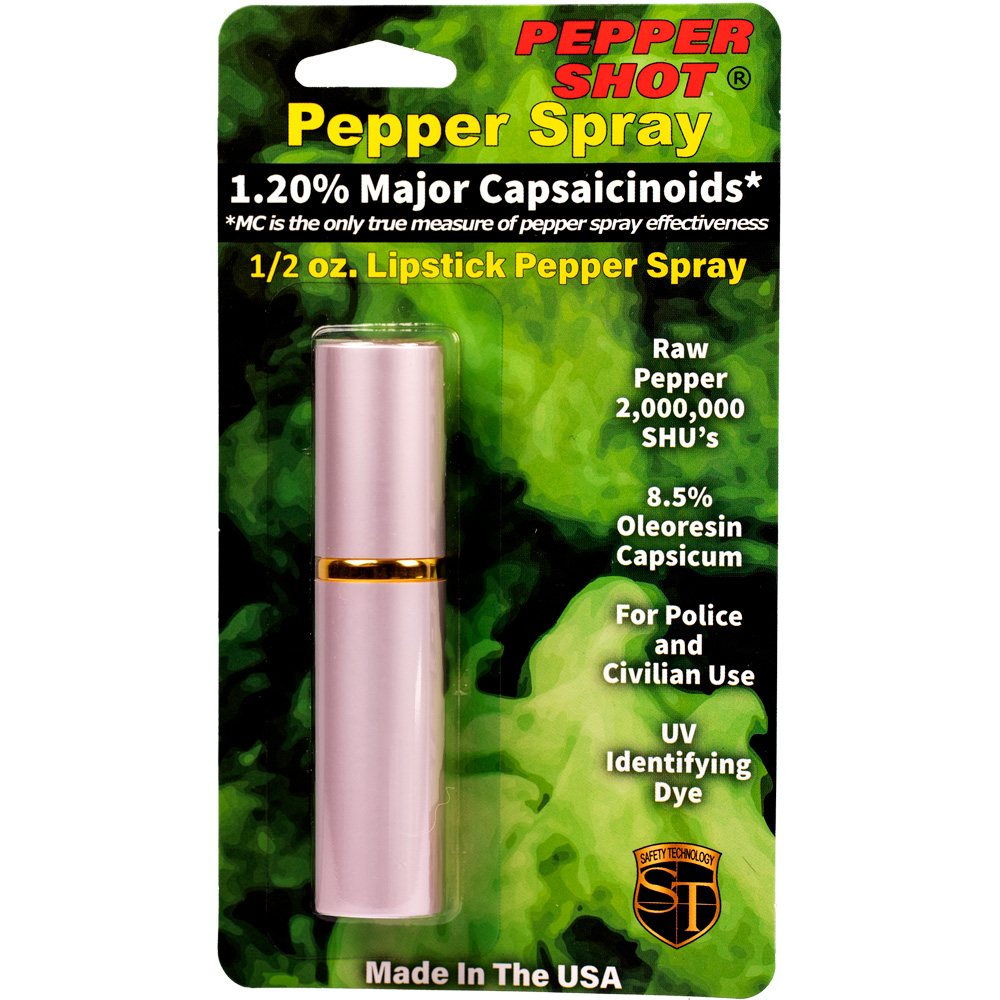 Pepper Shot 1.2% MC 1/2 oz lipstick pepper spray pink. Its's designed for women. Pepper Shot Pepper Spray is made with 1.2% Major Capsaicinoids. The Major Capsaicinoids are the true heat measure and Pepper Shot 1.2% MC is more effective than of most other pepper sprays. In addition to causing an attacker pain, The Pepper Shot 8.5% oleoresin capsicum formula swells the mucous membranes, which makes breathing difficult, and swells the veins in the eyes, causing the eyes to close. It's made from 2,000,000 SHU's of raw pepper and these effects can last up to 45 minutes and cause no permanent damage. Has a UV identifying dye to help aid in the identification of an attacker. This lipstick model is designed for women. The attractive lipstick case is sure to deceive and ward off potential attackers. Pretend you need to freshen your lipstick and POW! This ½ oz canister contains 6-10 one-second sprays with a range of 6-8 feet and is available in 4 colors. - Black, Pink, Red, and Silver 4” x ⅞”