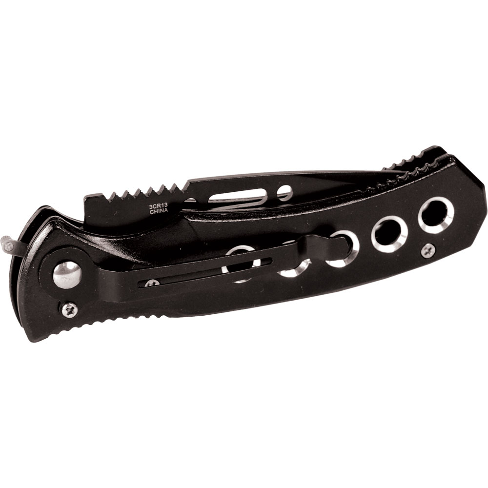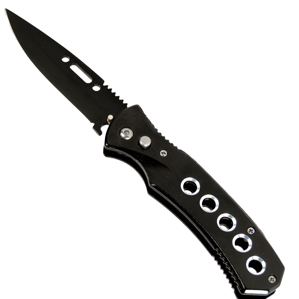 Automatic Heavy Duty Knife with 5 hole handle and safety lock. Black Color • Automatic Knife with Safety Lock • 8” Overall Length • 3 1/2” Blade • Stainless Steel Handle