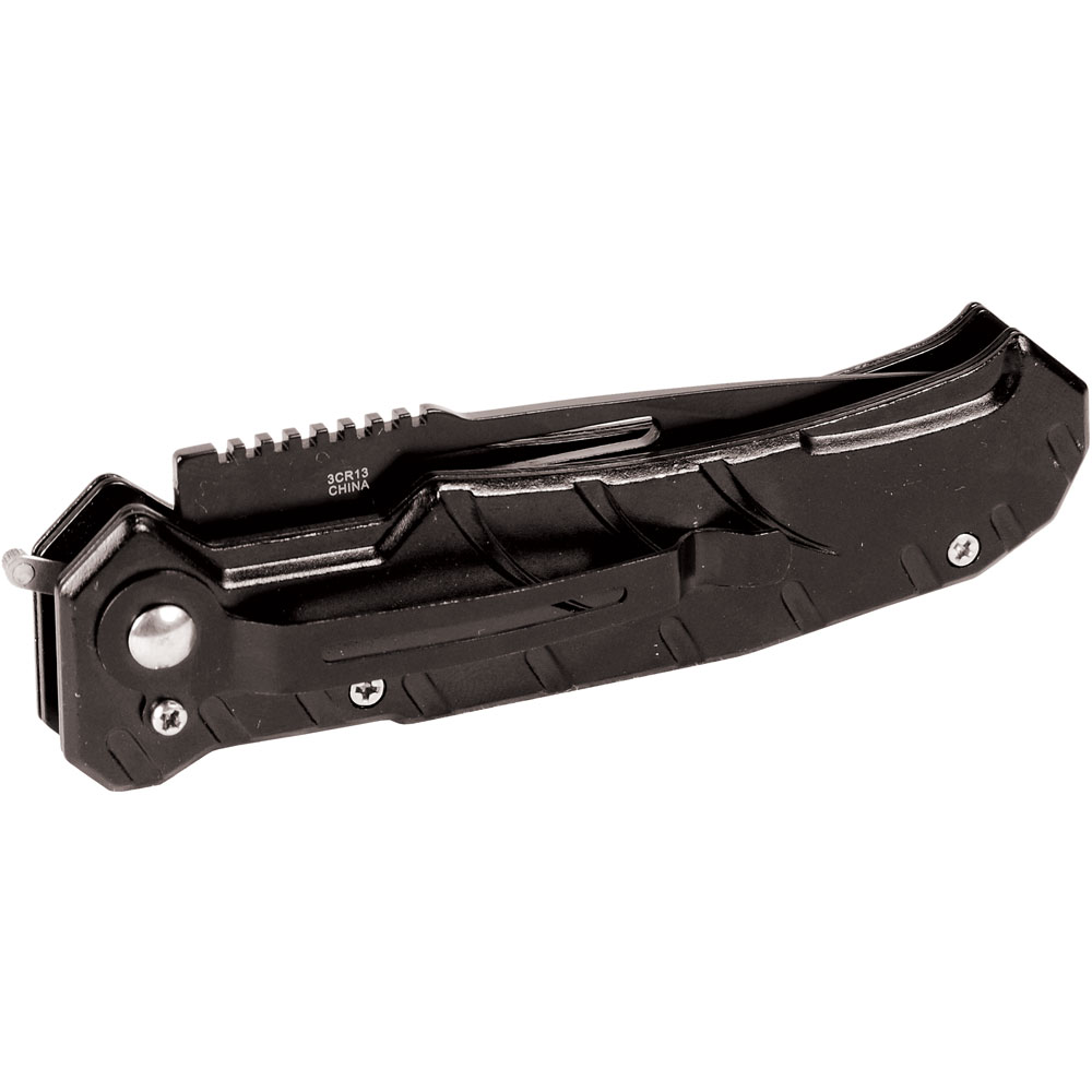 Automatic Heavy Duty Knife with solid handle and safety lock. Black Color • Automatic Knife with Safety Lock • 8” Overall Length • 3 1/2” Blade • Stainless Steel Handle