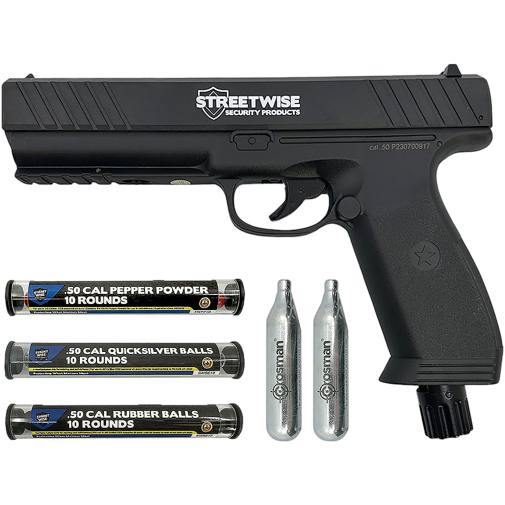 Fight back against increasingly aggressive and brazen criminals with the latest self-defense product: The HEAT Pepper Launcher. Made by Streetwise Security Products, the leader in the personal security products industry for nearly 35 years, the HEAT fires .50 caliber pepper rounds, metal balls, or rubber balls at almost 500 feet per second to allow you to safely defend yourself from up to 60 feet away. Not only will your target experience the powerful impact from the round but when firing Streetwise pepper rounds, they will also be instantly enveloped in an incapacitating pepper cloud. It allows both civilians and law enforcement officers to subdue criminals with less than lethal force. Our streets are no longer safe. Never walk alone. Carry the HEAT. Features: Semi-automatic pistol holds 6 rounds of .50 caliber pepper balls, inert training rounds, metal balls, or rubber balls Maximum strength pepper rounds: 5% PAVA Perfect aim not required: pepper rounds explode on impact creating a 6-foot cloud of pepper The effect of the pepper is immediate causing temporary loss of sight, severe coughing, gagging, wheezing, subduing your target, and giving you plenty of time to get away. Unlike other self-defense products, close contact with your assailant is not required. The HEAT has an effective range of up to 60 feet Fast and easy to load and fire Picatinny rail for mounting accessories like flashlights and laser sights No background checks or permits required Safety trigger Dimensions: 9.7” x 1.7” x 9.7” Complete Kit contains: 10 Rubber Balls 10 Pepper Rounds (5% PAVA) 10 Quicksilver (metal composite) Rounds 2 CO2 Canisters