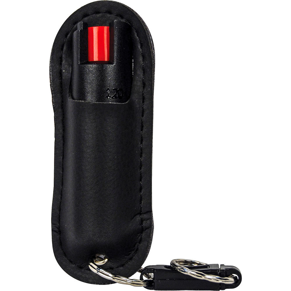 WildFire 1.4% MC 1/2 oz Halo Holster and quick release keychain black. The WILDFIRE® PEPPER SPRAY is hot, hot, hot. The Major Capsaicinoids are the true heat measure, WildFire has the hottest on the market at 1.4% Major Capsaicinoids. In addition to causing an attacker pain, The WildFire 10% oleoresin capsicum formula swells the mucous membranes, which makes breathing difficult, and swells the veins in the eyes, causing the eyes to close. It's made from 2,000,000 SHU's of raw pepper and these effects can last up to 45 minutes and cause no permanent damage. Has a UV identifying dye to help aid in the identification of an attacker. Wildfire 1/2 oz. Pepper Spray has a range of 6-8 feet and comes with a leatherette halo holster. Each unit provides 6-10 one-second bursts and comes with a quick key release keychain, and safety lock. 4 ¼" x 1 ⅝"