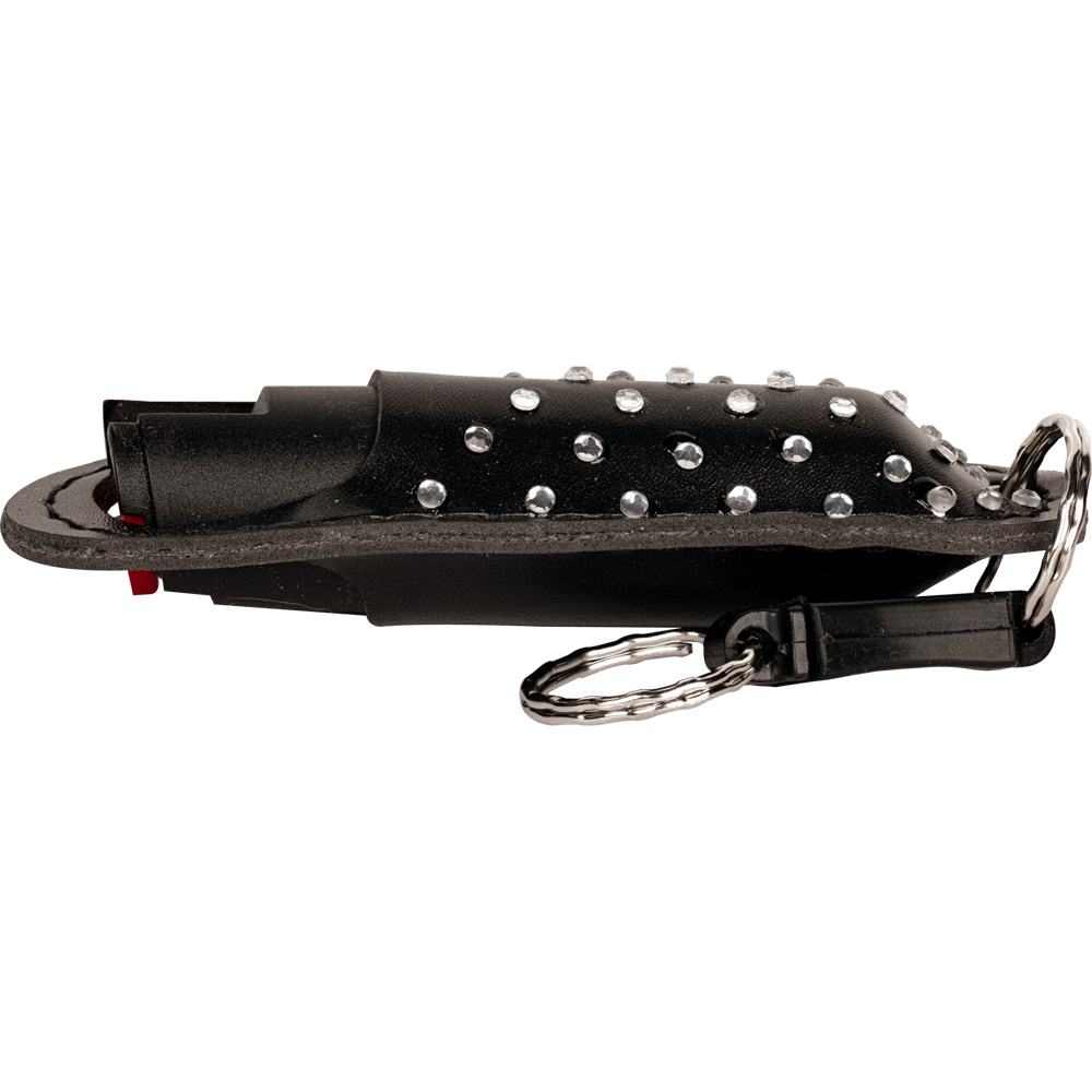 WildFire 1.4% MC 1/2 oz Halo Rhinestone Holster and quick release keychain black. The WILDFIRE® PEPPER SPRAY is hot, hot, hot. The Major Capsaicinoids are the true heat measure, WildFire has the hottest on the market at 1.4% Major Capsaicinoids. In addition to causing an attacker pain, The WildFire 10% oleoresin capsicum formula swells the mucous membranes, which makes breathing difficult, and swells the veins in the eyes, causing the eyes to close. It's made from 2,000,000 SHU's of raw pepper and these effects can last up to 45 minutes and cause no permanent damage. Has a UV identifying dye to help aid in the identification of an attacker. Wildfire 1/2 oz. Pepper Spray has a range of 6-8 feet and comes with a leatherette halo rhinestone holster. Each unit provides 6-10 one-second bursts and comes with a quick key release keychain, and safety lock. 4 ¼" x 1 ⅝"