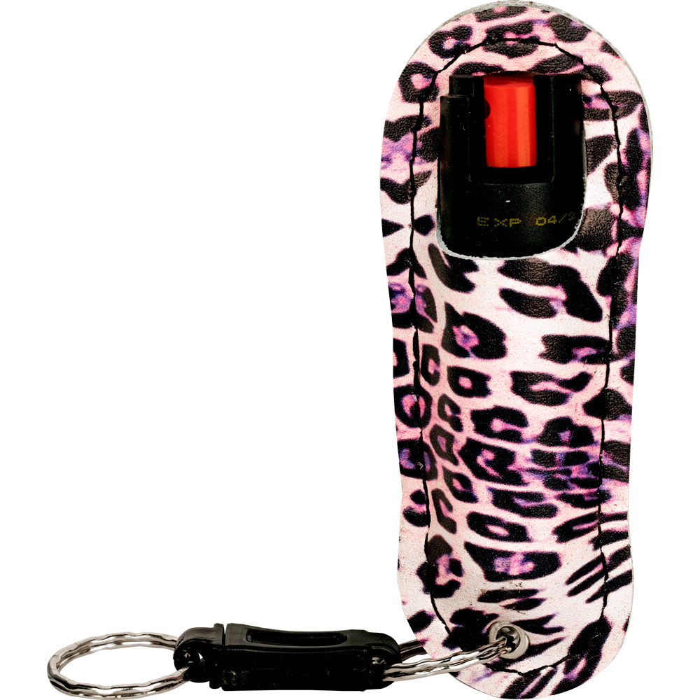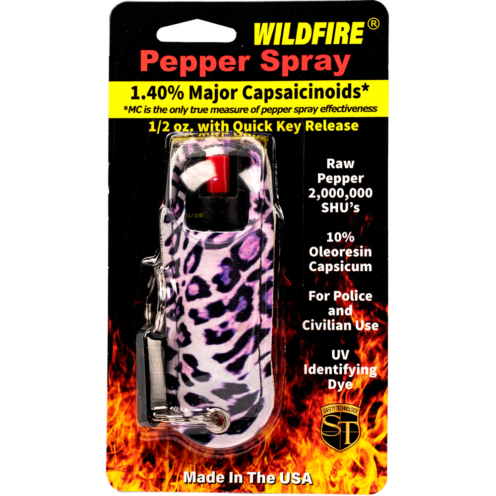 WildFire 1.4% MC 1/2 oz Halo Holster and quick release keychain Leopard Black/Purple. The WILDFIRE® PEPPER SPRAY is hot, hot, hot. The Major Capsaicinoids are the true heat measure, WildFire has the hottest on the market at 1.4% Major Capsaicinoids. In addition to causing an attacker pain, The WildFire 10% oleoresin capsicum formula swells the mucous membranes, which makes breathing difficult, and swells the veins in the eyes, causing the eyes to close. It's made from 2,000,000 SHU's of raw pepper and these effects can last up to 45 minutes and cause no permanent damage. Has a UV identifying dye to help aid in the identification of an attacker. Wildfire 1/2 oz. Pepper Spray has a range of 6-8 feet and comes with a leatherette halo holster. Each unit provides 6-10 one-second bursts and comes with a quick key release keychain, and safety lock. 4 ¼" x 1 ⅝"