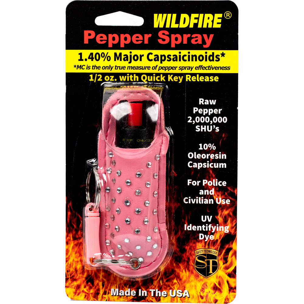 WildFire 1.4% MC 1/2 oz Halo Rhinestone Holster and quick release keychain pink. The WILDFIRE® PEPPER SPRAY is hot, hot, hot. The Major Capsaicinoids are the true heat measure, WildFire has the hottest on the market at 1.4% Major Capsaicinoids. In addition to causing an attacker pain, The WildFire 10% oleoresin capsicum formula swells the mucous membranes, which makes breathing difficult, and swells the veins in the eyes, causing the eyes to close. It's made from 2,000,000 SHU's of raw pepper and these effects can last up to 45 minutes and cause no permanent damage. Has a UV identifying dye to help aid in the identification of an attacker. Wildfire 1/2 oz. Pepper Spray has a range of 6-8 feet and comes with a leatherette halo rhinestone holster. Each unit provides 6-10 one-second bursts and comes with a quick key release keychain, and safety lock. 4 ¼" x 1 ⅝"