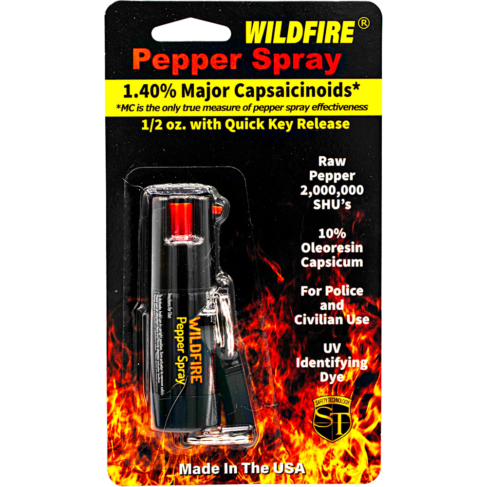 Wildfire 1/2 oz Pepper Spray w/Quick Key Release Key Chain. The WILDFIRE® PEPPER SPRAY is hot, hot, hot. The Major Capsaicinoids are the true heat measure, WildFire has the hottest on the market at 1.4% Major Capsaicinoids. In addition to causing an attacker pain, The WildFire 10% oleoresin capsicum formula swells the mucous membranes, which makes breathing difficult, and swells the veins in the eyes, causing the eyes to close. It's made from 2,000,000 SHU's of raw pepper and these effects can last up to 45 minutes and cause no permanent damage. Has a UV identifying dye to help aid in the identification of an attacker. Wildfire 1/2 oz. Pepper Spray has a range of 6-8 feet and comes with a quick release keychain and pocket clip. Each unit provides 6-10 one-second bursts and comes with a safety lock. 3 ⅝" x 1"