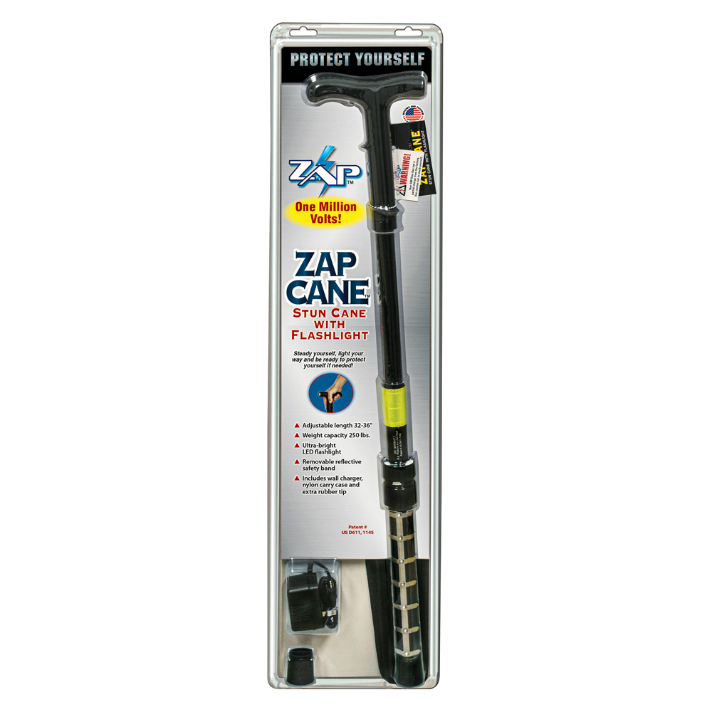 This ZAP Stun Walking Cane is a great self-defense device for the elderly or for anyone who needs support while walking. This walking cane measures 32 inches and can be easily extended to 36 inches to accommodate users of different height. When threatened, you can either use the built-in super bright LED flashlight to blind your attacker or deliver a shocking 1 million volts of electric power that will cause your attacker's muscles to lose control, effectively immobilizing him for 5-10 minutes. Having a length of 32 to 36 inches also means that you can defend against your assailant from a safe distance away. This stun walking cane also comes with a built-in rechargeable battery. Supports up to 250 lbs. Features: ••1 million volts of stopping power or 4.6 milliamps ••7 1/2" of shocking electrodes wrap the entire bottom ••Intimidating electrical arc and crackle ••Adjustable cane length of 32-36" ••Weight capacity of 250 lbs ••Safety indicator light with on/off switch ••Built-in ultra-bright 30 Lumens LED flashlight ••Built-in rechargeable Ni-MH battery ••Includes high quality nylon carrying case ••Includes AC adaptor for easy battery recharge ••Includes extra rubber tip for the end of the cane ••NOTE: PLEASE CHARGE STUN GUN FOR 8 HOURS when you receive it. It will not operate properly until fully charged.